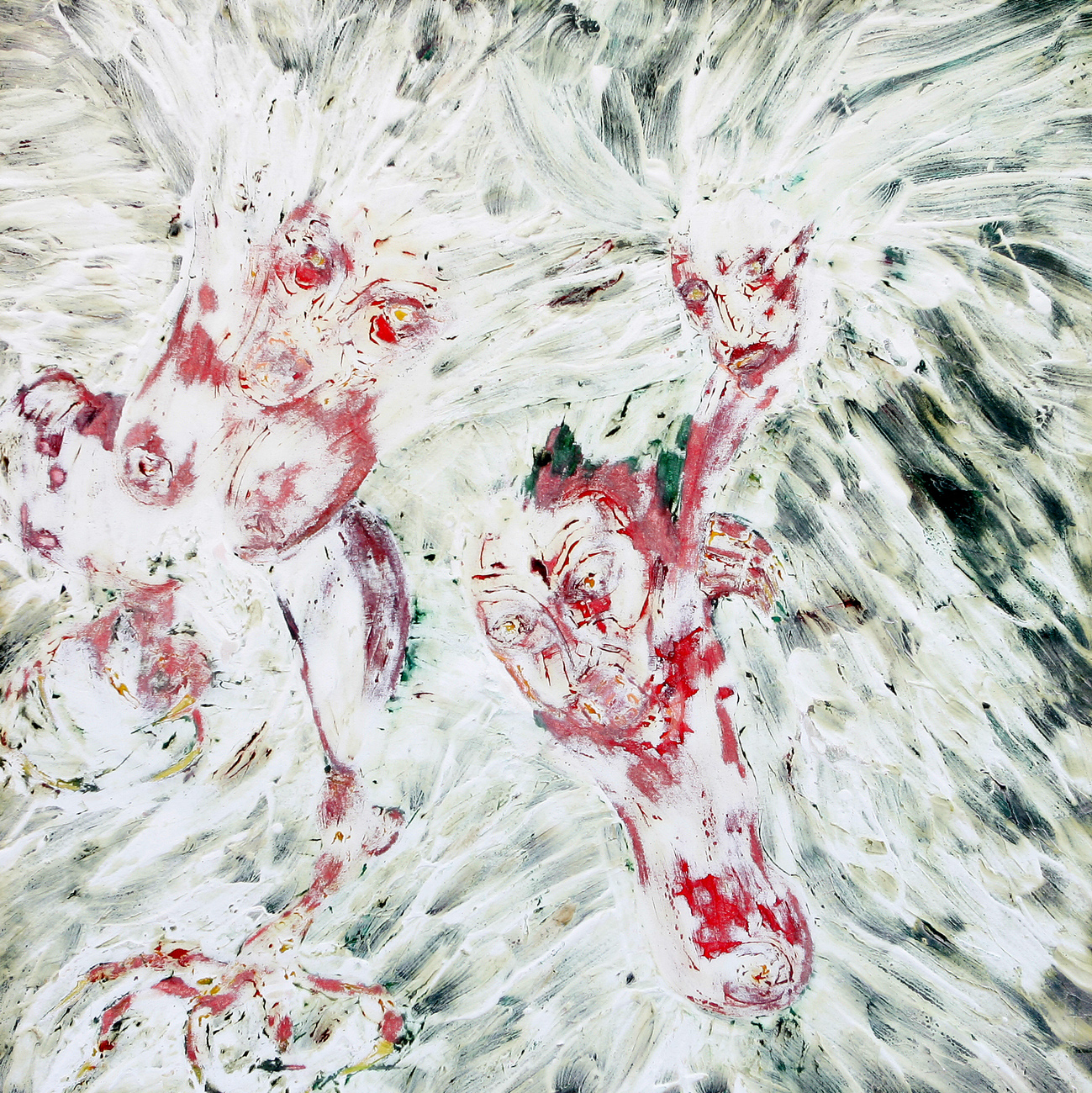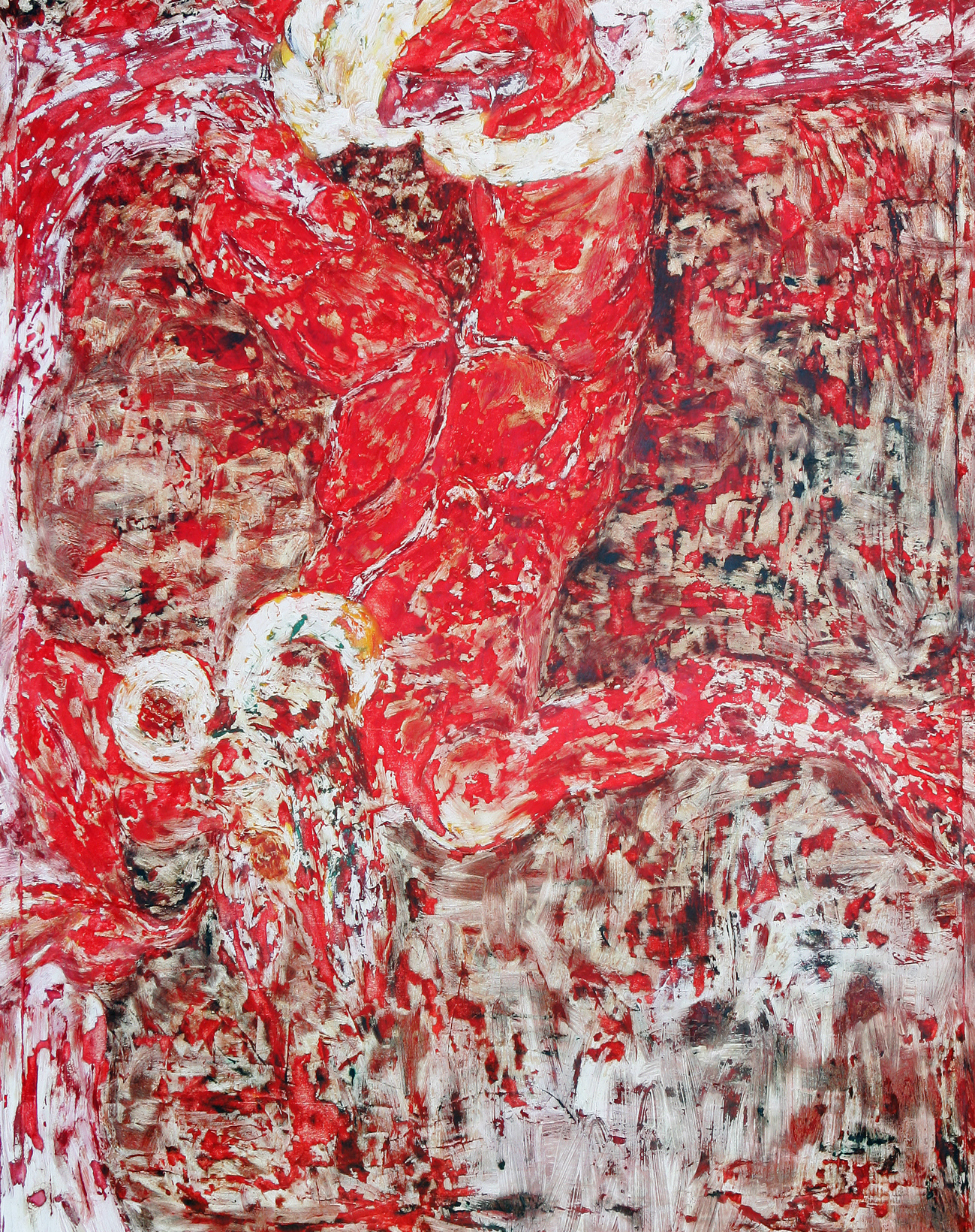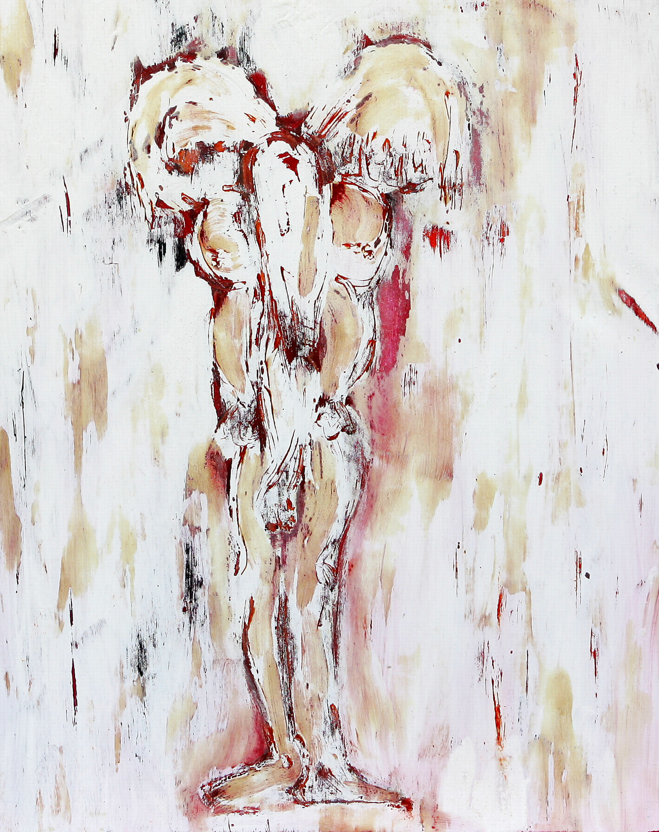 Die Arbeiten sind alle auf der Basis der Ölmalerei entstanden. Die Themen und Motive sind zunächst mit Ölfarbe (Pinsel und Spachtel) auf der Leinwand gestaltet und in diesem Stadium des Arbeitsprozesses „fertig". Jetzt müssen die Farben etwas antrocknen (in der Regel zwei Tage, obwohl die unterschiedlichen Farben auch unterschiedlich schnell bzw. langsam antrocknen – z.B. trocknet Ultramarinblau schneller als Krapplackrot), bevor der nächste Arbeitsabschnitt beginnen kann. Über diese Ergebnisse ziehe ich dann mit dem Pinsel und dem Spachtel breiig angerührten Füllspachtel der in kürzester Zeit antrocknet (ein paar Stunden). Das ursprüngliche Werk ist jetzt unter einer durchgängig weißen, reliefartig strukturierten Fläche verborgen und befindet sich im zweiten Stadium.