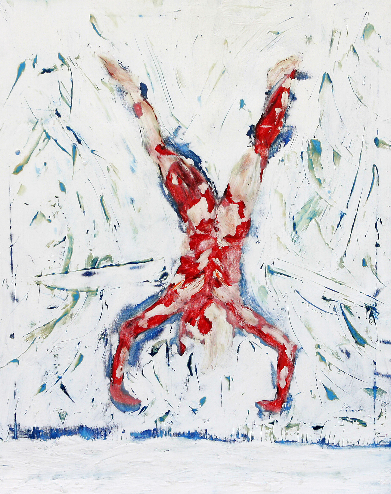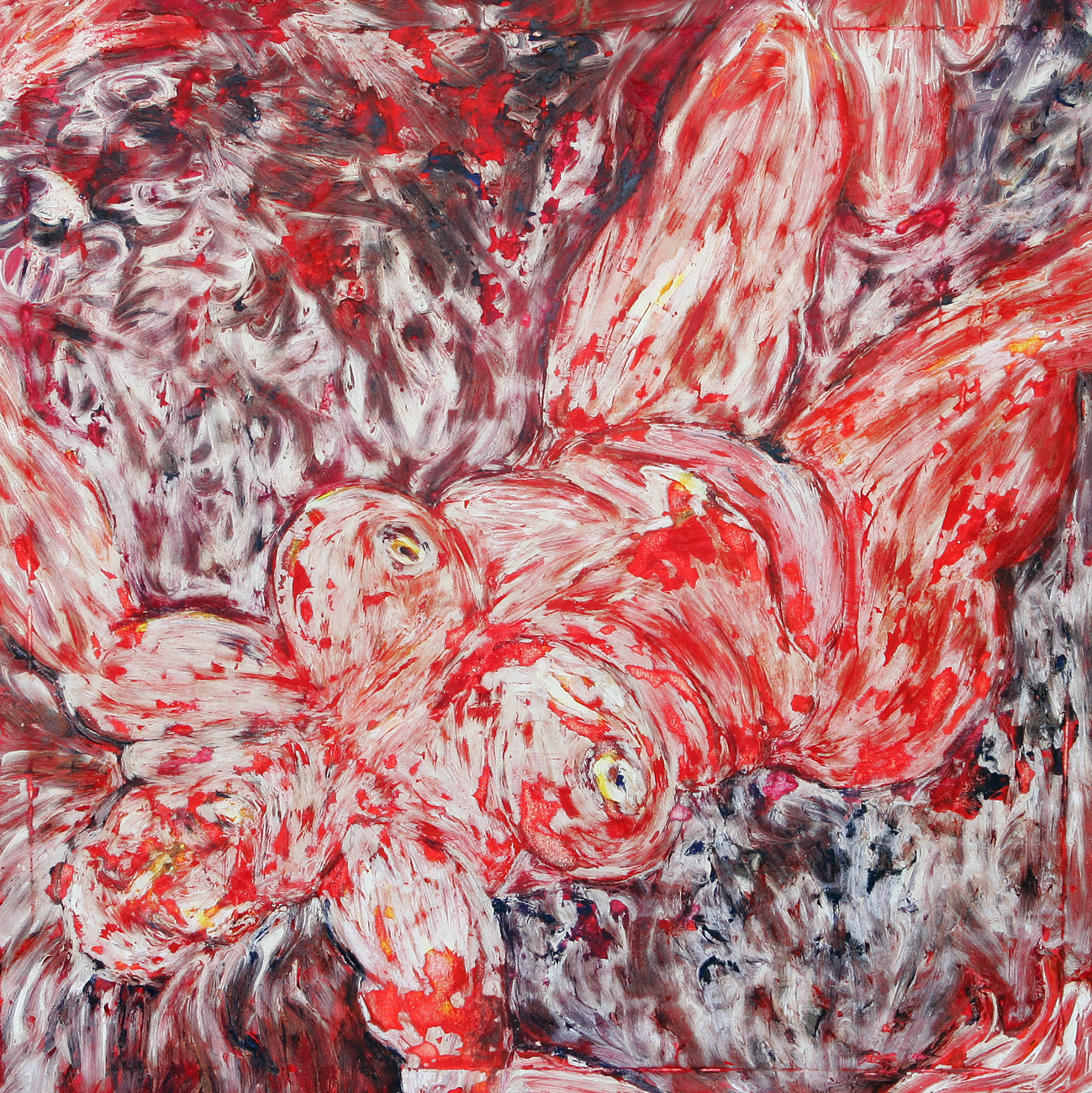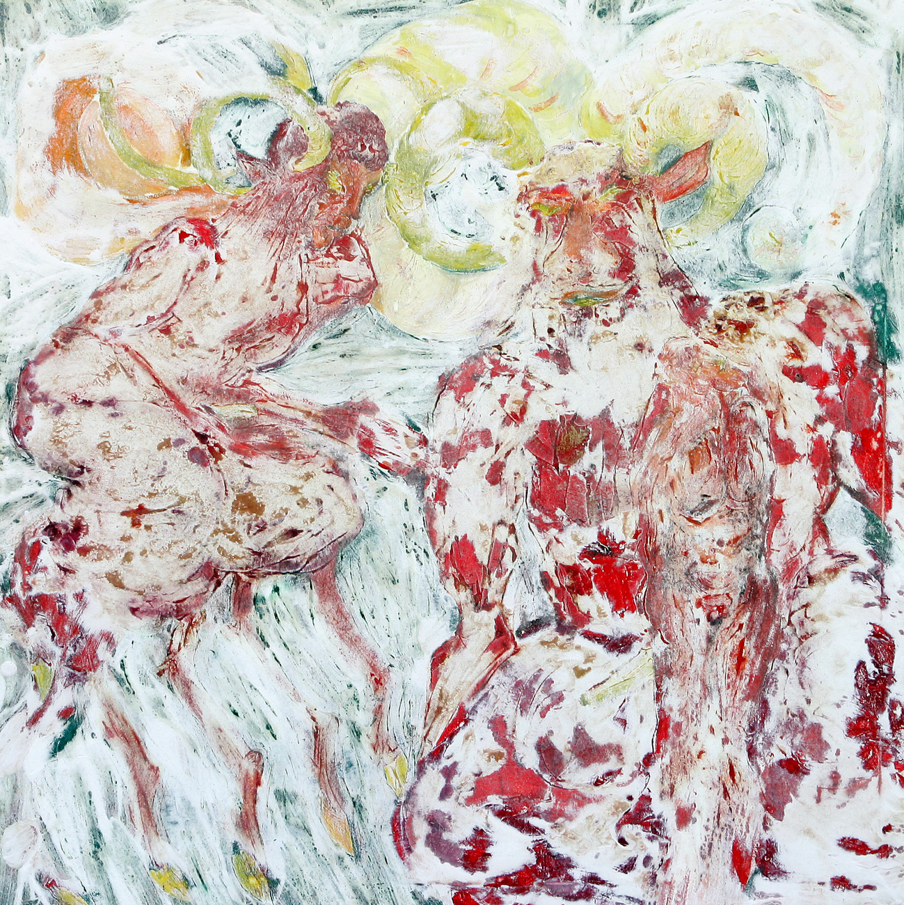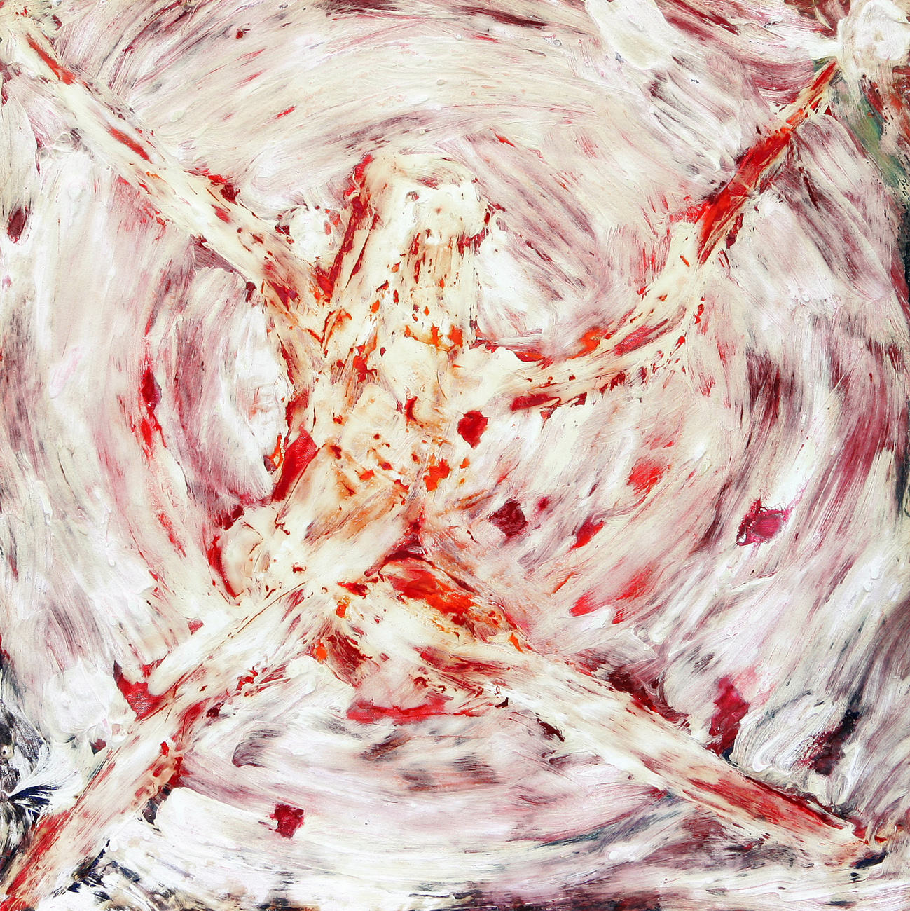 Die Arbeiten sind alle auf der Basis der Ölmalerei entstanden. Die Themen und Motive sind zunächst mit Ölfarbe (Pinsel und Spachtel) auf der Leinwand gestaltet und in diesem Stadium des Arbeitsprozesses „fertig". Jetzt müssen die Farben etwas antrocknen (in der Regel zwei Tage, obwohl die unterschiedlichen Farben auch unterschiedlich schnell bzw. langsam antrocknen – z.B. trocknet Ultramarinblau schneller als Krapplackrot), bevor der nächste Arbeitsabschnitt beginnen kann. Über diese Ergebnisse ziehe ich dann mit dem Pinsel und dem Spachtel breiig angerührten Füllspachtel der in kürzester Zeit antrocknet (ein paar Stunden). Das ursprüngliche Werk ist jetzt unter einer durchgängig weißen, reliefartig strukturierten Fläche verborgen und befindet sich im zweiten Stadium.